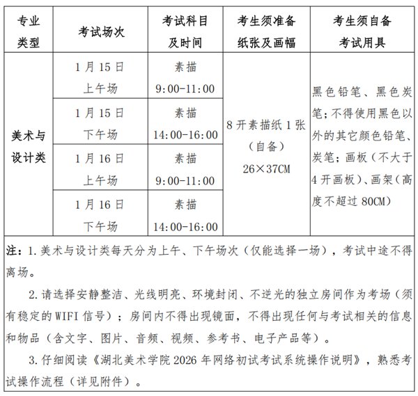 欢迎报考湖北美术学院!现将我校2026年普通本科招生考试美术与设计类网络初试报名及考试事宜公告如下: